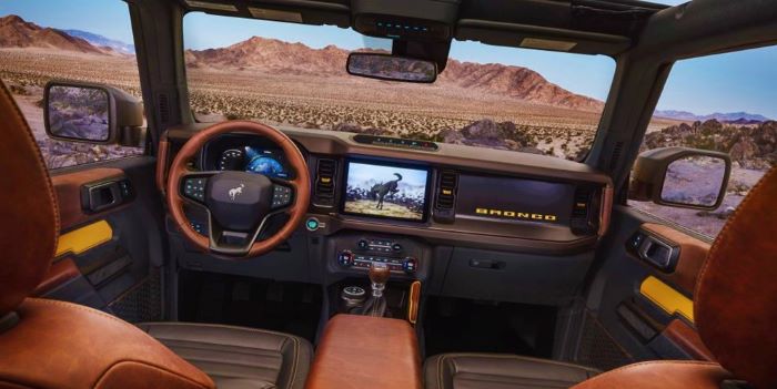 فورد برونكو 2021 من الداخل السيارة تاتي السيارة بألواح هيكل قابلة للإزالة وتفاجئنا بتصميم داخلي فخم بقدر ما هو عملي .لا يشبه التصميم الداخلي أي شيء رأيناه من قبل من تشكيلة برونكو فورد. مع وجود أكثر من 7 خيارات للقطع ، فإن وسائل الراحة التي يتم توفيرها في برونكو فورد هائلة. من ناحية المعلومات والترفيه ، يوفرنظام شاشة لمس LCD مقاس 12 بوصة احتياجات الترفيه الخاصة بك. يتم دمجه مع تطبيق FordPass Performance ، والذي يتضمن أيضًا بيانات خرائط مفصلة للغاية لمساعدتك في تلك الرحلات الصعبة على الطرق الوعرة.